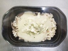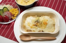 国産米のきのこ入りバターライスの上に低温殺菌乳のホワイトソースがかかったドリア。レンジ調理に向くようにソースはゆるめでライスによくからみます。