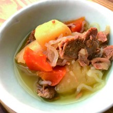 <原材料>じゃがいも、豚肉、玉ねぎ、人参、こんにゃく、発酵調味料、砂糖、昆布だし、醤油、鰹だし、椎茸だし、食塩、水酸化Ca(こんにゃく凝固剤)