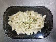 <原材料>牛乳(熊本県)、エルボパスタ、薄力粉(小麦:国産)、玉ねぎ、菜種油、シュレッドチーズ、バター、キビ砂糖、塩、白コショウ、乾燥パセリ