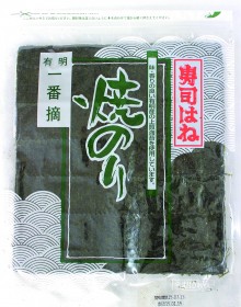 本来、寿司に使えないと言う意味の「寿司はね」。キズものであったりと商品価値の下がったものを指す。ここでは、有明海産秋芽一番摘みの海苔を使用し、栄養価の高い時期の海苔をお徳用として開発。色、艶、やわらかさなどは上等品と比べ劣るが味は秋芽一番摘みならではの甘味のある海苔。